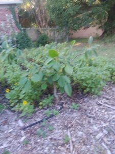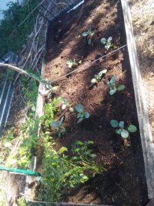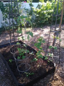 In one of the square beds we’ve got a cayenne pepper plant along with some broccoli, all from transplants. In another some beans that are growing very well and some carrot seeds that have not sprouted up too much yet.