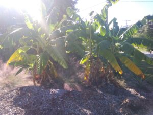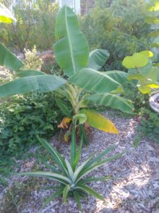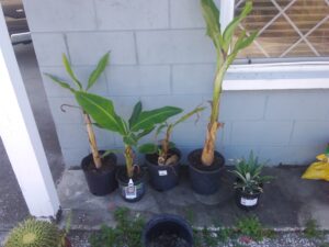 We started with one dwarf banana plant, which is now two large plants plus one smaller plant. I’ve also got a few pups growing in pots to potentially give away (and a pineapple)