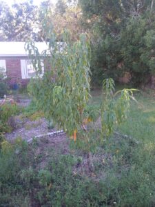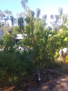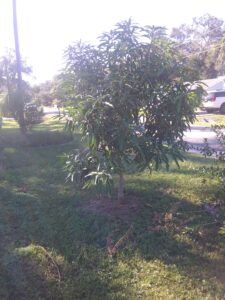 There are several fruit trees in the front yard, two peach trees, a mango tree, and an avocado tree